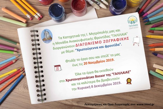 Τα Κατηχητικά της Ιεράς Μητροπόλεως Μεσογαίας και Λαυρεωτικής (Ι.Μ.Μ.Λ.) σε συνεργασία με τη Μονάδα Ανακουφιστικής Φροντίδας (Μ.Α.Φ.) «ΓΑΛΙΛΑΙΑ» διοργανώνουν διαγωνισμό ζωγραφικής με στόχο την ευαισθητοποίηση των παιδιών στην εθελοντική διακονία, στις αρχές της Ανακουφιστικής Φροντίδας και την προαγωγή των εικαστικών τους δεξιοτήτων.