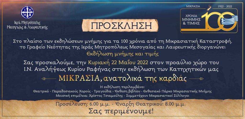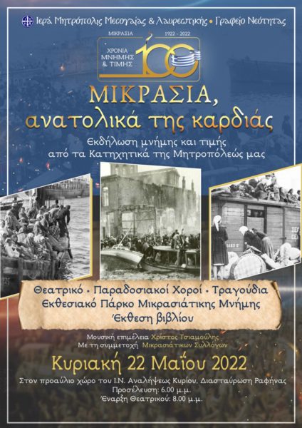 Στο πλαίσιο των εκδηλώσεων μνήμης για τα 100 χρόνια από την Μικρασιατική Καταστροφή, το Γραφείο Νεότητος της Ιεράς Μητροπόλεως Μεσογαίας & Λαυρεωτικής διοργανώνει εκδήλωση μνήμης και τιμής με τίτλο «ΜΙΚΡΑΣΙΑ, Ανατολικά της καρδιάς» την Κυριακή 22 Μαΐου και ώρα 6:00 μ.μ. στον προαύλιο χώρο του Ι.Ν Αναλήψεως του Κυρίου Διασταύρωσης Ραφήνας.