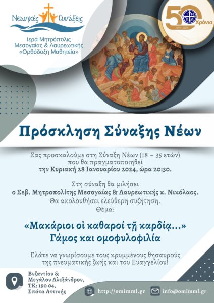 Ενδιαφέρουσα ομιλία με θέμα “”Μακάριοι οι καθαροί τη καρδία”. Γάμος και ομοφυλοφιλία” με ομιλητή τον Σεβ. Μητροπολίτη Μεσογαίας και Λαυρεωτικής κ. Νικόλαο, θα πραγματοποιηθεί την Κυριακή, 28 Ιανουαρίου 2024, και ώρα 20:30, στην έδρα της Ιεράς Μητροπόλεως στα Σπάτα.
