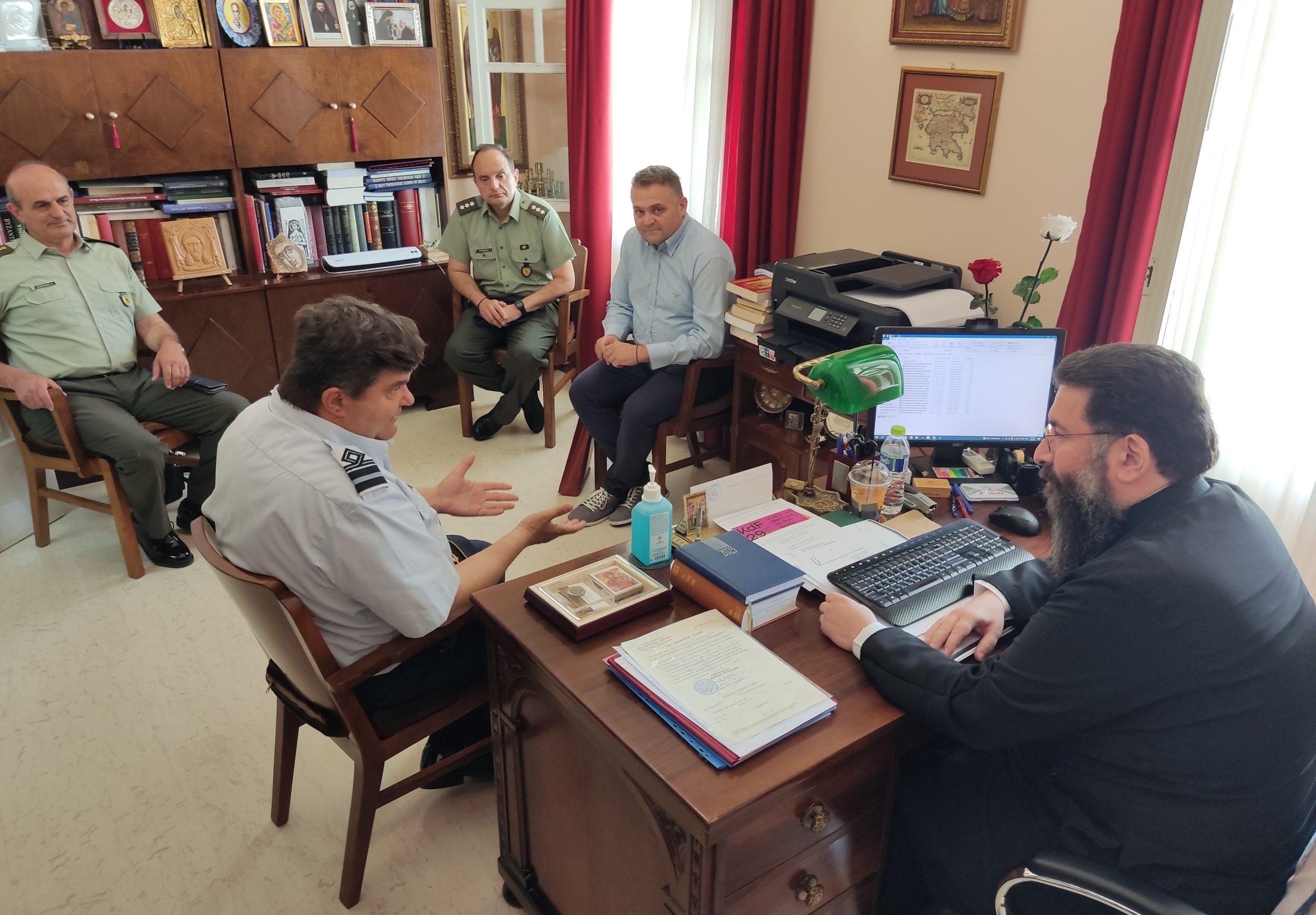 Ένεκα της απουσίας του Σεβασμιωτάτου στην Αλεξάνδρεια της Αιγύπτου και της συμμετοχής του στην Μεικτή Επιτροπή Διαλόγου Ορθοδόξων και Ρωμαιοκαθολικών, τους υψηλούς επισκέπτες δέχθηκε ο Πρωτοσύγκελλος της Ιεράς Μητροπόλεως Αρχιμ. Φίλιππος Χαμαργιάς, ο οποίος εξέφρασε την ευαρέσκεια του Σεβασμιωτάτου και τα συγχαρητήριά του για την εξέλιξη του Μουσείου, τονίζοντας πως “Η Εκκλησία συμπαραστέκεται στο έργο αυτό που εκπέμπει Ιστορία και Πολιτισμό”. Όπως χαρακτηριστικά είπε “Η από μέρους της Ιεράς Μητροπόλεως παραχώρηση του κτιρίου αποτελεί έμπρακτη αναγνώριση του έργου αυτού και συνέχεια της προσευχής μας «υπέρ του κατά ξηράν, θάλασσαν και αέρα φιλοχρίστου ημών Στρατού»”.