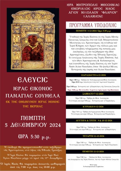 Μέσα στα πλαίσιο ης λατρευτικής και λειτουργικής ζωής της Εκκλησίας μας και της πανηγύρεως της Ενορίας του Αγίου Νικολάου (Φλαρίου) Καλαμάτας αλλά και τιμώντας την συμπλήρωση εκατό ετών από την ανταλλαγή των πληθυσμών (1924-2024), η Ιερά Μητρόπολη Μεσσηνίας θα υποδεχθεί με κάθε μεγαλοπρέπεια και λαμπρότητα, την Εφέστιο Εικόνα της Υπεραγίας Θεοτόκου, της καλουμένης «Σουμελιωτίσσης», εκ του Πανελληνίου Ιερού Προσκυνήματος Παναγίας Σουμελά, για πρώτη φορά στην πόλη της Καλαμάτας, κατά το χρονικό διάστημα από 5ης έως 12ης Δεκεμβρίου 2024, προς ευλογία και αγιασμό του Χριστεπώνυμου Πληρώματος, της Ιεράς Μητροπόλεως και προς τιμήν των εν Καλαμάτα απογόνων Ποντίων και Μικρασιατών προσφύγων, κατόπιν εγκρίσεως της Ιεράς Συνόδου της Εκκλησίας της Ελλάδος.
