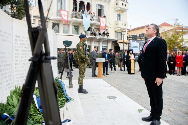 Ακολούθησε η τέλεση Επιμνημόσυνης Δέησης στη μνήμη των Ηρώων και κατάθεση στεφάνων, ενώ αίσθηση προκάλεσε το γεγονός ότι ο Δήμαρχος της Καλαμάτας κ. Αθ. Βασιλόπουλος, πριν καταθέσει το στεφάνι στο μνημείο, ασπάσθηκε το Ιερό Ευαγγέλιο, δεχόμενος το θερμό χειροκρότημα των παρισταμένων.
