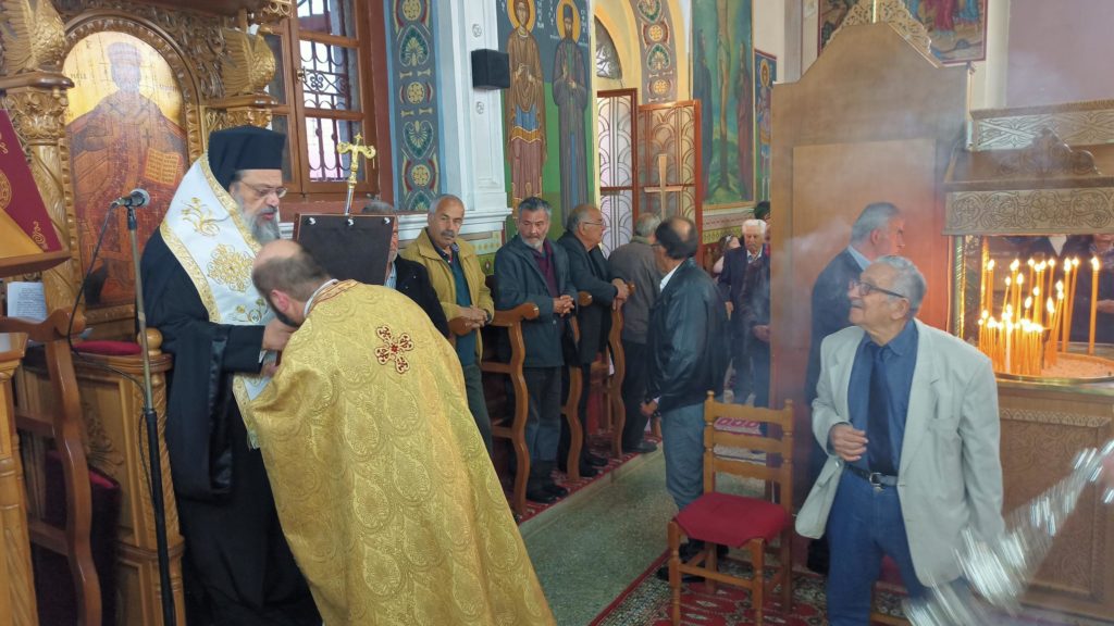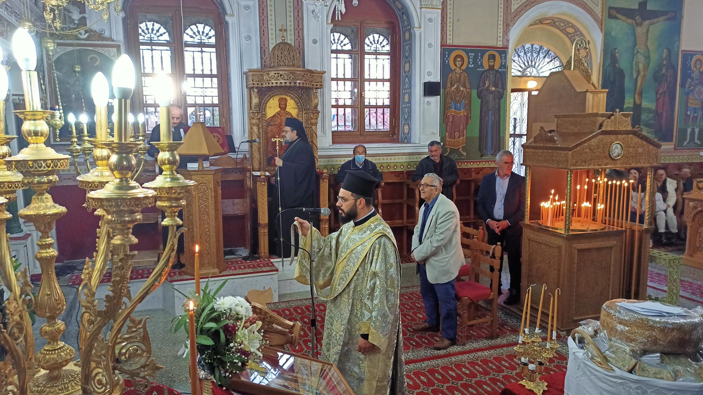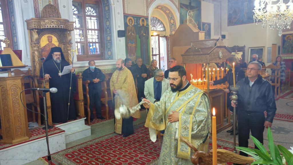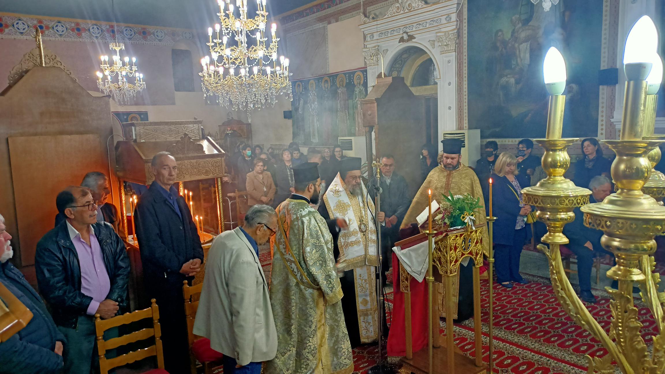 Ο Σεβασμιώτατος ανέγνωσε τη Δ’ Στάση των Χαιρετισμών ενώπιον της ιεράς εικόνος του Ευαγγελισμού της Θεοτόκου, πλαισιωμένος από τον εφημέριο του Ναού Οικον. Κυριάκο Μπακολέα και τον Διάκονο Θεόφιλο Κυριάκο, παρουσία πιστών εκ της ευρύτερης περιοχής.