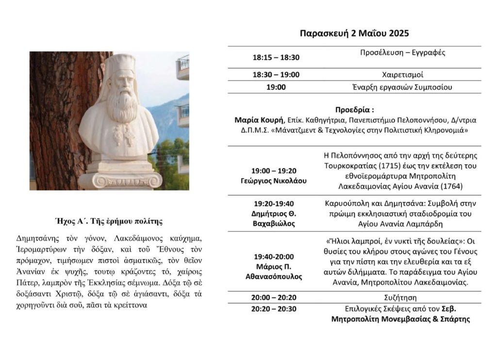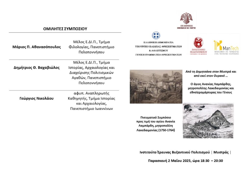 Η Ιερά Μητρόπολη Μονεμβασίας και Σπάρτης, με αφορμή τη συμπλήρωση τριών ετών από την αγιοκατάταξη, από την Αγία και Μεγάλη Σύνοδο της του Χριστού Μεγάλης Εκκλησίας, του Αγίου Ανανία Λαμπάρδη, Μητροπολίτη Λακεδαιμονίας και εθνοΐερομάρτυρος του Γένους, διοργανώνει Πνευματικό και Επιμορφωτικό Συμπόσιο προς τιμήν του, σε συνεργασία με τη Γενική Γραμματεία Θρησκευμάτων και το Διατμηματικό Πρόγραμμα Μεταπτυχιακών Σπουδών «Μάνατζμεντ & Τεχνολογίες στην Πολιτιστική Κληρονομιά» του Πανεπιστημίου Πελοποννήσου, την Παρασκευή 2 Μαΐου 2025 στο Ινστιτούτο Έρευνας Βυζαντινού Πολιτισμού, στον Μυστρά.