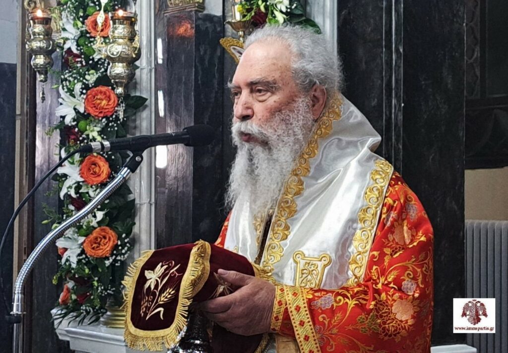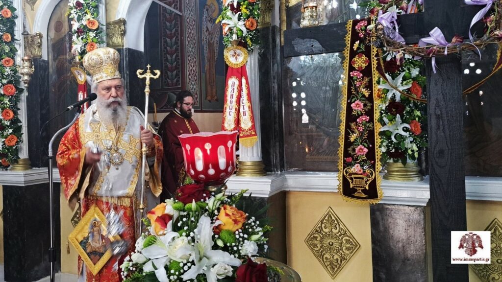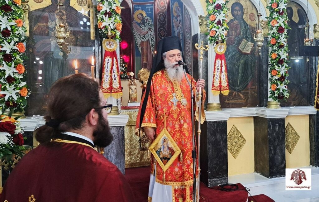 Στον μελίρρυτο λόγο του, ο σεπτός Ποιμενάρχης μίλησε αρχικά για την αποστολική περικοπή της ημέρας, που αναφερόταν στην απολογία του αποστόλου Παύλου προς τον Βασιλιά Αγρίππα, όπου ο Παύλος διηγείται το όραμα που είχε και το οποίο τον οδήγησε να ακολουθήσει με ζήλο και θυσιαστικό πνεύμα τον Χριστιανισμό, συμβάλλοντας αποφασιστικά στη διάδοσή του. Στη συνέχεια, ο Σεβασμιώτατος μίλησε για το όραμα του Αγίου Κωνσταντίνου με το περίφημο ‘’Εν Τούτω Νίκα’’, που οδήγησε στην καθιέρωση του Τιμίου και Ζωοποιού Σταυρού και την εδραίωση του Χριστιανισμού με σειρά σημαντικών αποφάσεων. Παράλληλα, επισήμανε την ειλικρινή μετάνοια και την βάπτιση του Αγίου Κωνσταντίνου προς το τέλος της ζωής του, που τον οδήγησαν στην Αγιότητα. Ακολούθως, έγινε αναφορά στην μορφή της Αγίας Ελένης και ιδίως στην πίστη και την αποφασιστικότητά της να εντοπίσει τον Σταυρό του μαρτυρίου του Κυρίου μας. Ολοκληρώνοντας, ευχήθηκε οι δύο Άγιοι να προστατεύουν και να καθοδηγούν τους ευλαβείς χριστιανούς της περιοχής.