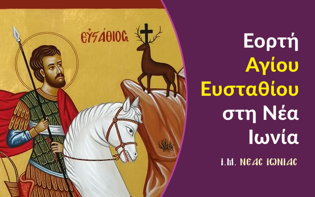 Με την ευκαιρία της εορτής του Αγίου ενδόξου μεγαλομάρτυρος Ευσταθίου και της συνοδείας αυτού πανηγυρίζει ο φερώνυμος Ιερός Ναός στη Νέα Ιωνία, στον οποίο φυλάσσεται τεμάχιο εκ του Ιερού Λειψάνου του Αγίου. Οι Ιερές Ακολουθίες θα τελεσθούν σύμφωνα με το ακόλουθο πρόγραμμα της Μητρόπολης Νέας Ιωνίας Φιλαδελφείας, Ηρακλείου και Χαλκηδόνος.