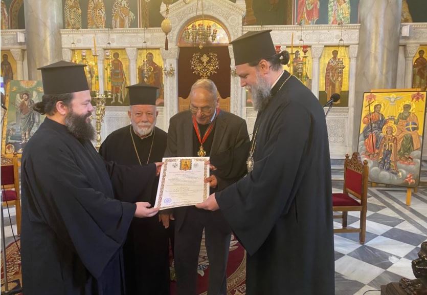 Μετά το πέρας της Συνάξεως, ο Σεβασμιώτατος τίμησε τον κ. Φειδά με την ανώτατη τιμητική διάκριση της Ιεράς Μητροπόλεως, ήτοι το παράσημο του Πολιούχου αυτής, Ιερομάρτυρος Αγίου Γεωργίου του Νεαπολίτου, για την ανεκτίμητη προσφορά του στην Εκκλησία, τη Θεολογία, τα γράμματα και τον πολιτισμό.