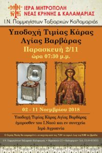 Την Τιμία Κάρα της Αγίας Βαρβάρας υποδέχεται η Καλαμαριά. H τελετή υποδοχής θα γίνει την Παρασκευή 2 Νοεμβρίου στο Ιερό Ναό Παμμεγίστων Tαξιαρχών Καλαμαριάς και θα ακολουθήσει Ιερά Αγρυπνία.