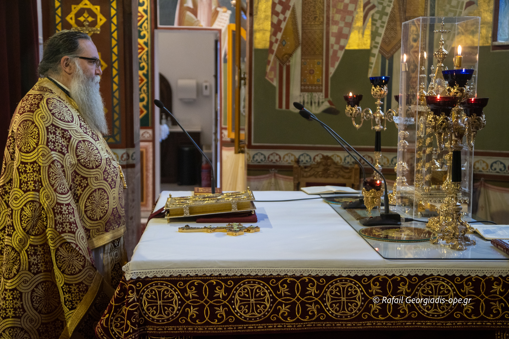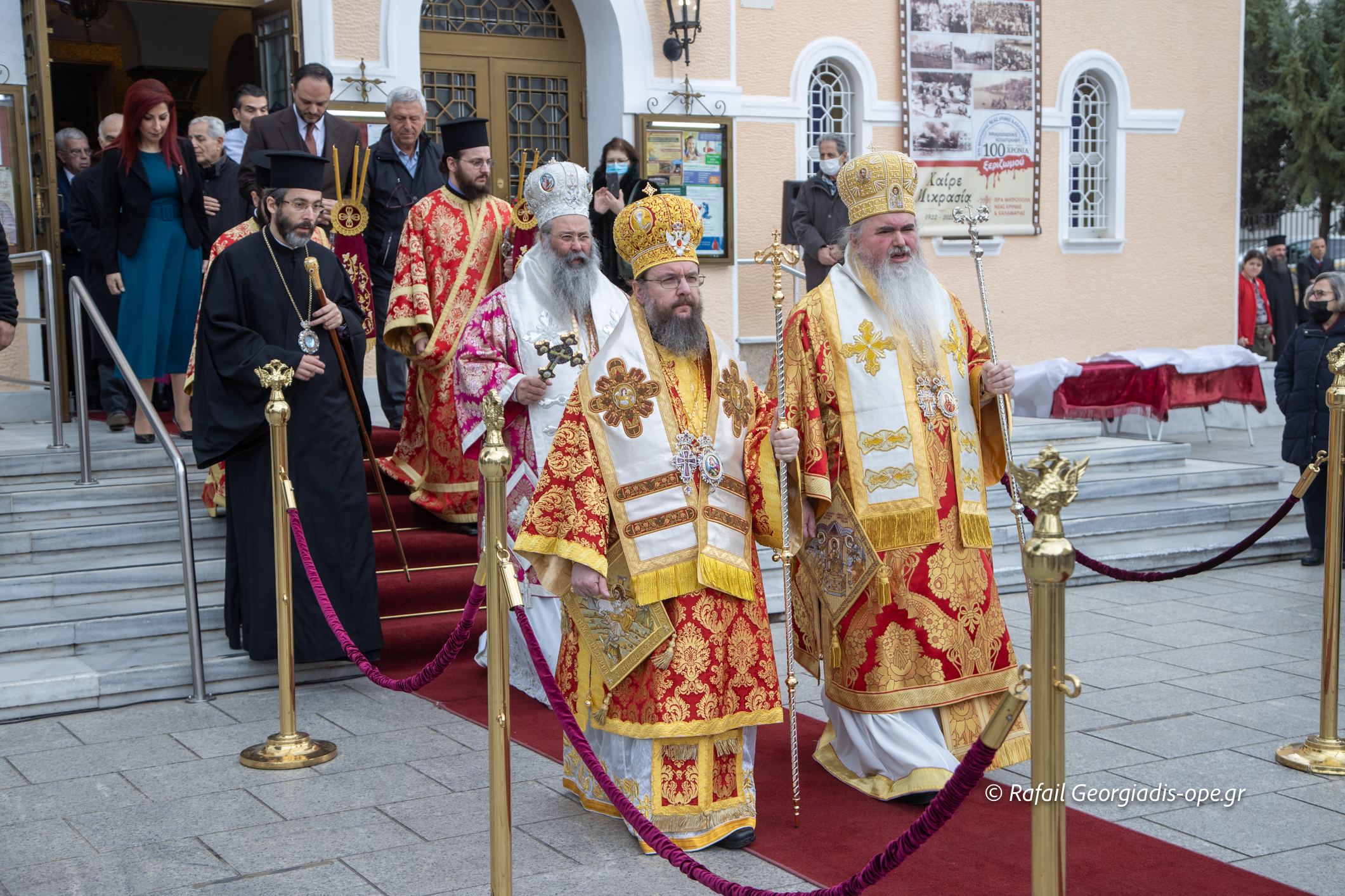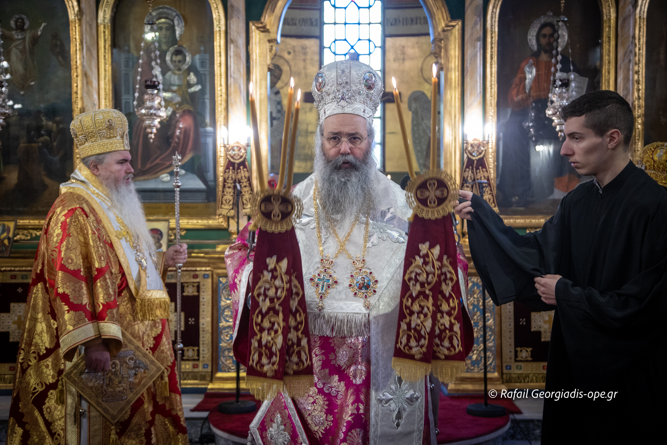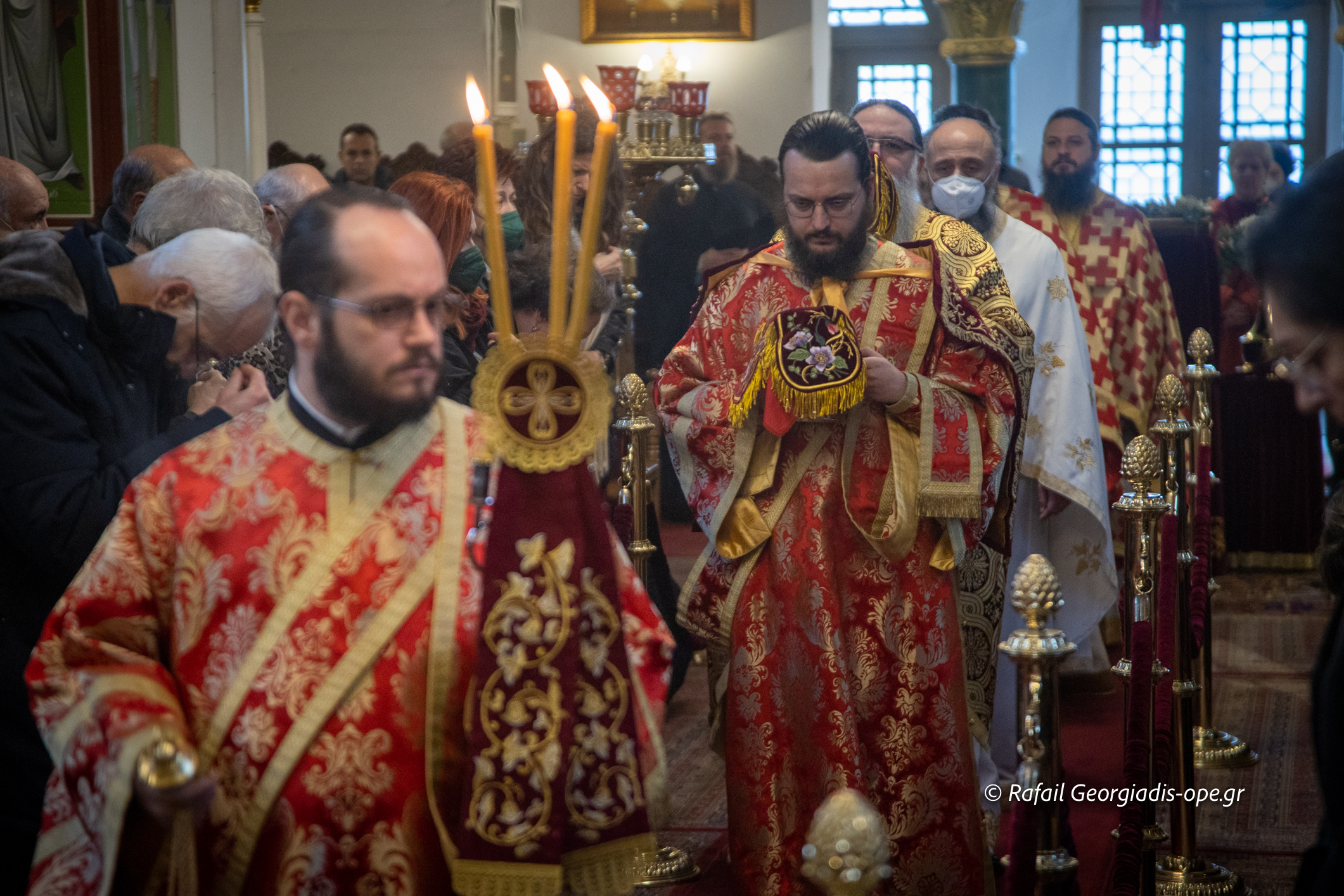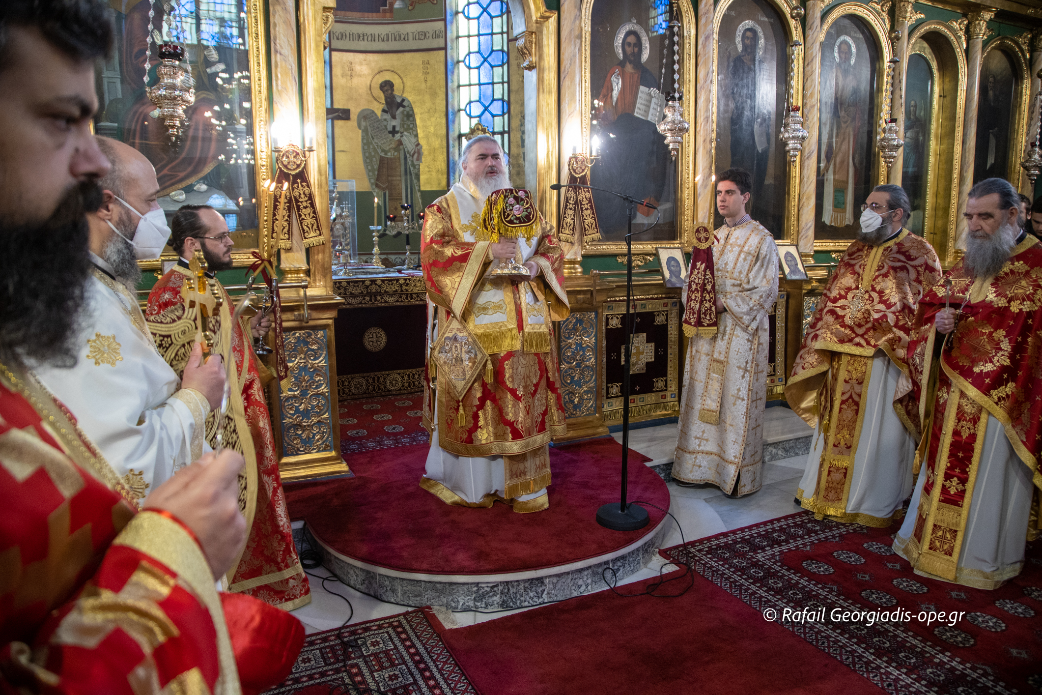 Προεξήρχε ο Μητροπολίτης Κίτρους, Κατερίνης και Πλαταμώνος κ.Γεώργιος τον οποίο πλαισίωσαν ο Μητροπολίτης Αιτωλίας και Ακαρνανίας κ.Δαμασκηνός και ο οικείος ποιμενάρχης Μητροπολίτης Νέας Κρήνης και Καλαμαριάς κ. Ιουστίνος. Στο ιερό συμπροσευχόμενος ήταν ο Μητροπολίτης Σαράντα Εκκλησιών από το Οικουμενικό Πατριαρχείο κ.Ανδρεάς.