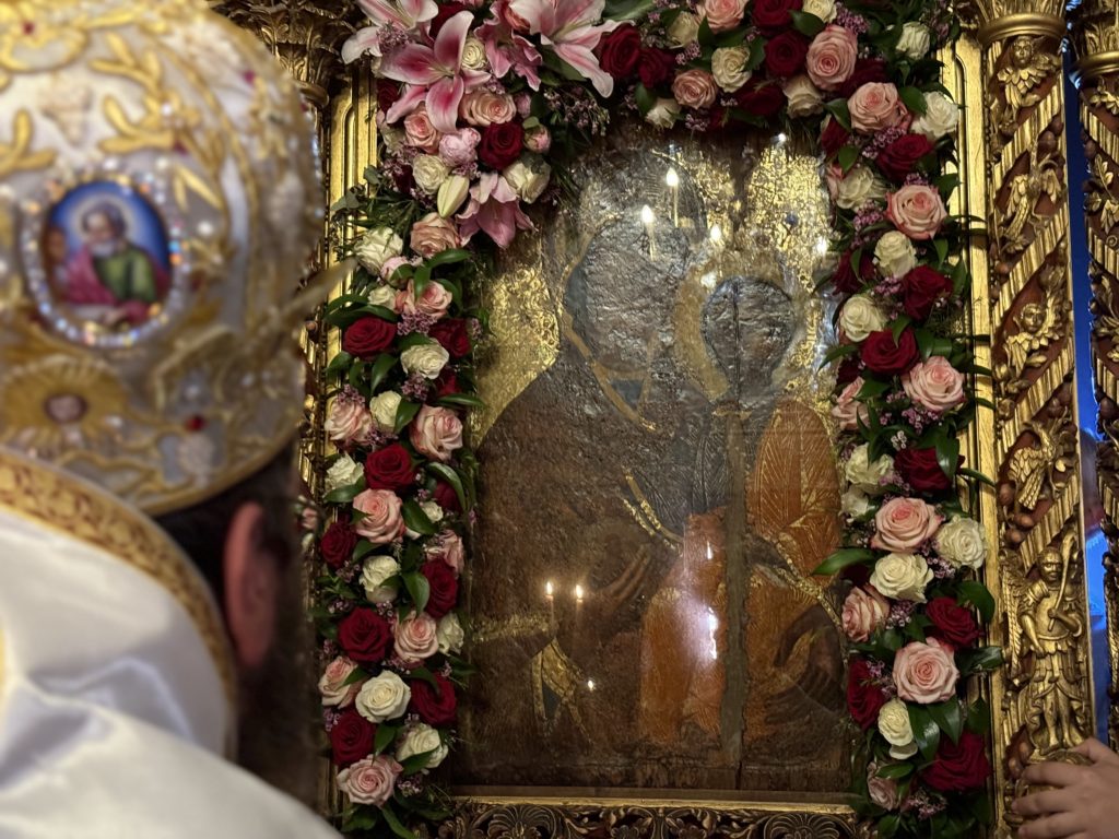 Σχηματιζόμενης μικράς λιτανευτική πομπής, εντός του ιερού Ναού, η θαυματουργός ιερά Εικόνα τοποθετήθηκε πανηγυρικά στο θρονί Της.