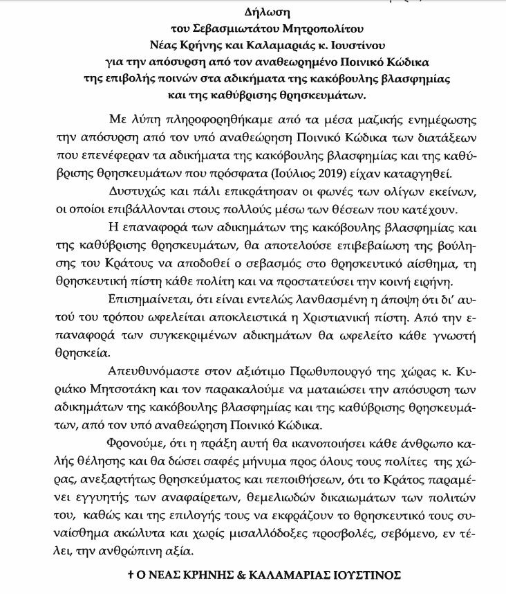 Την λύπη του για την απόφαση της κυβέρνησης να αποσύρει από τον αναθεωρημένο Ποινικό Κώδικα το αδίκημα της κακόβουλης βλασφημίας και της καθύβρισης θρησκευμάτων, εκφράζει με ανακοίνωσή του ο Μητροπολίτης Νέας Κρήνης και Καλαμαριάς κ. Ιουστίνος.