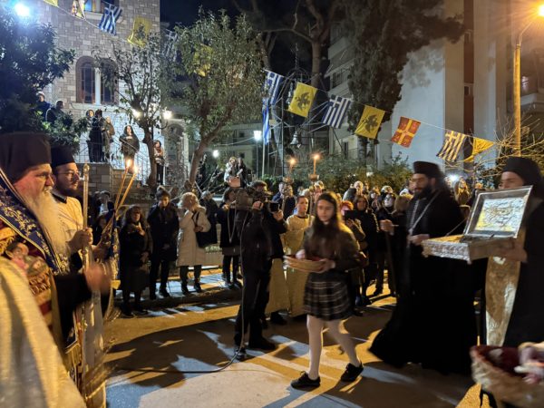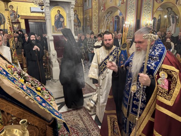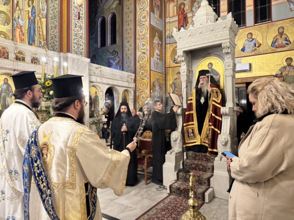 Ακολούθως, εψάλη η Ακολουθία της Γ’ Στάσης των Χαιρετισμών, ενώπιον του πιστού αντιγράφου της Παναγίας της Ευαγγελιστρίας της Τήνου, χοροστατούντος του οικείου Ποιμενάρχου κ. Ιουστίνου.