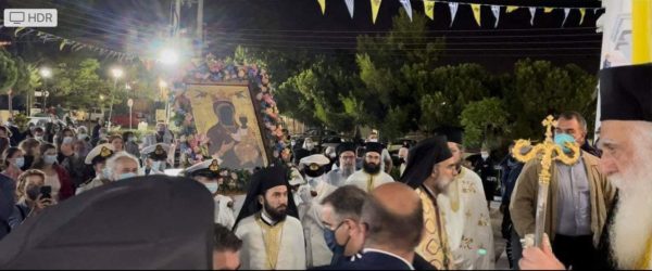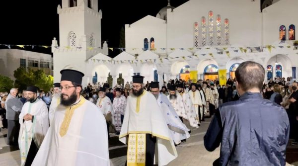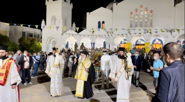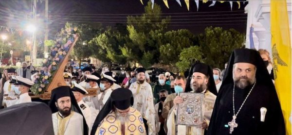 Χθες, τελέστηκε ο μέγας πανηγυρικός αρχιερατικός εσπερινός της Παναγίας της Μυρτιδιώτισσας, χοροστατούντος του Σεβασμιωτάτου Μητροπολίτου Νέας Σμύρνης κ. Συμεών. Ακολούθησε αρτοκλασία και Θείο Κήρυγμα, ενώ γύρω στις 20:30 έγινε η περιφορά της Ιεράς Εικόνος.