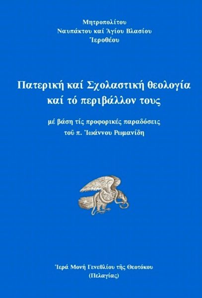 Το νέο βιβλίο του Σεβασμιότατου Μητροπολίτη Ναυπάκτου και Αγίου Βλασίου κ.κ. Ιεροθέου «Πατερική και Σχολαστική Θεολογία και το Περιβάλλον τους» και με υπότιτλο «Με βάση τις προφορικές παραδόσεις του π. Ιωάννου Ρωμανίδη» διαπραγματεύεται τη συνάντηση της ορθοδόξου θεολογίας με τα σύγχρονα θρησκευτικά και ιδεολογικά ρεύματα. Είναι ένα βιβλίο στο οποίο παρουσιάζεται από τη μια η πατερική θεολογία, η οποία είναι εμπειρική και στηρίζεται στην αποκάλυψη του Θεού στους Προφήτες, στους Αποστόλους και στους Πατέρες, με το οποίο αναδεικνύεται η μεγάλη αξία της ορθόδοξης θεολογίας και από την άλλη η σχολαστική θεολογία της δύσης, η οποία αποκλίνει από την προφητική, αποστολική και πατερική θεολογία, στηρίζεται στη φιλοσοφία και προσπαθεί να κατανοήσει το Θεό με τη λογική.