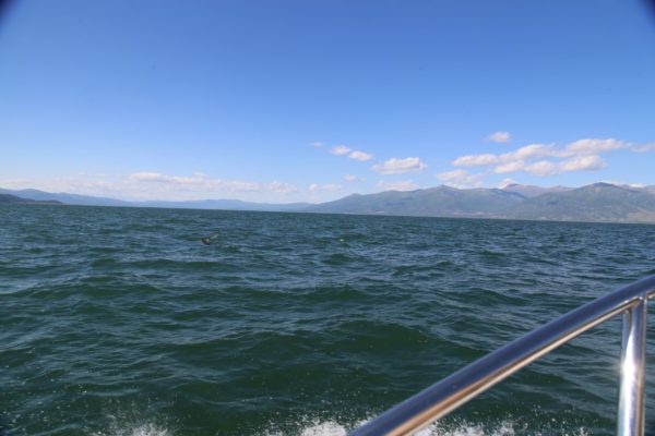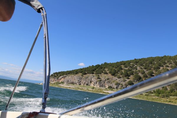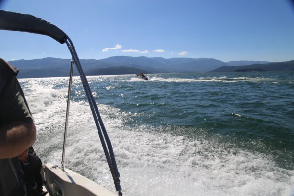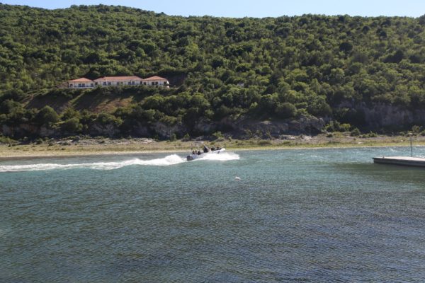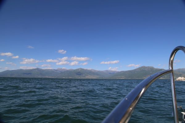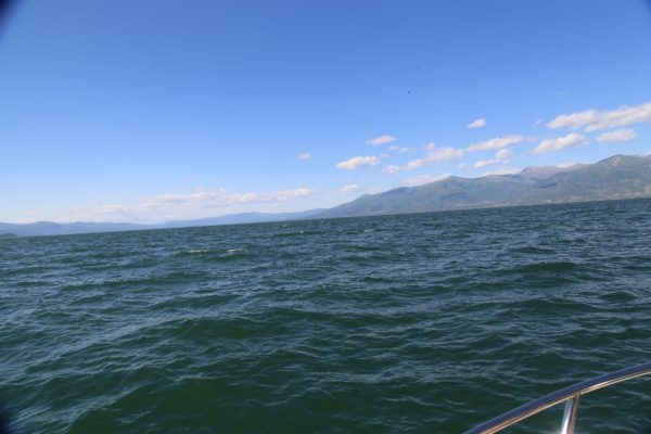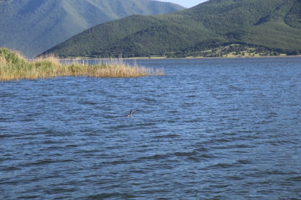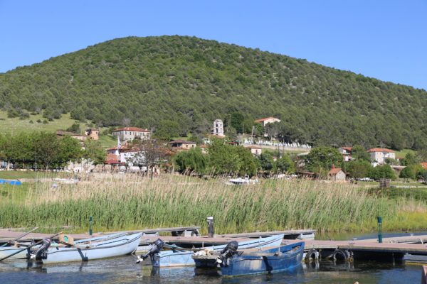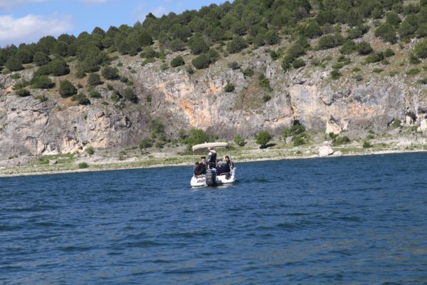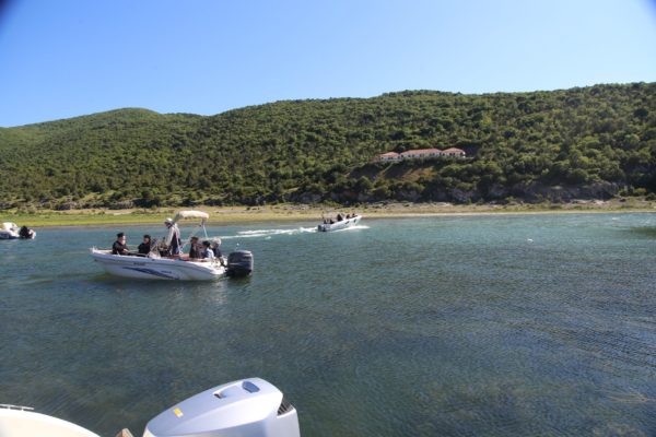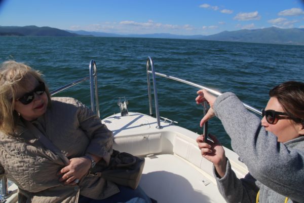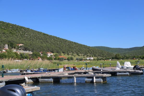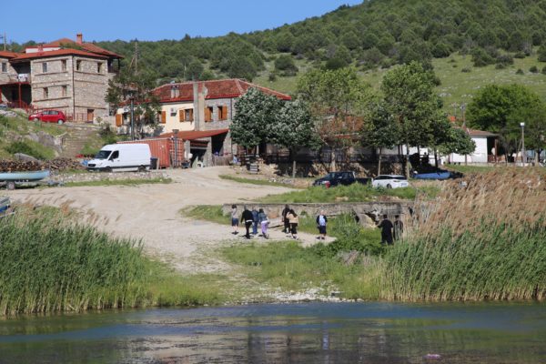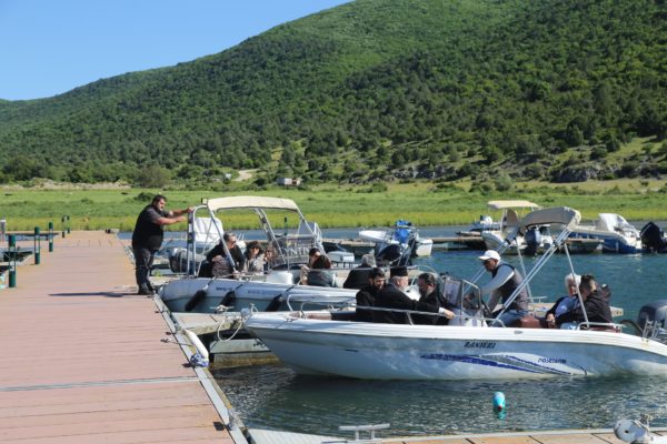 Πρώτος σταθμός στην Μεγάλη Πρέσπα ήταν ο οικισμός Ψαράδες, όπου ο άνεμος δημιουργούσε κύματα στην λίμνη. Γι’ αυτό λίγοι από τους εκδρομείς με βενζινοκίνητες βάρκες, τόλμησαν να κάνουν μια μικρή διαδρομή μέσα στην τρικυμισμένη Μεγάλη Πρέσπα και να ξεναγηθούν στα παραλίμνια ερημωμένα ασκηταριά. Δεύτερος σταθμός ήταν ο παλαιός Ιερός Ναός του αγίου Γερμανού και τρίτος, στην Μικρή Πρέσπα, τα ερείπια της μεγάλης Βασιλικής του Αγίου Αχιλλείου. Κάνοντας άσκηση σε αρκετή πεζοπορία επέστρεψαν οι εκδρομείς στην Καστοριά.