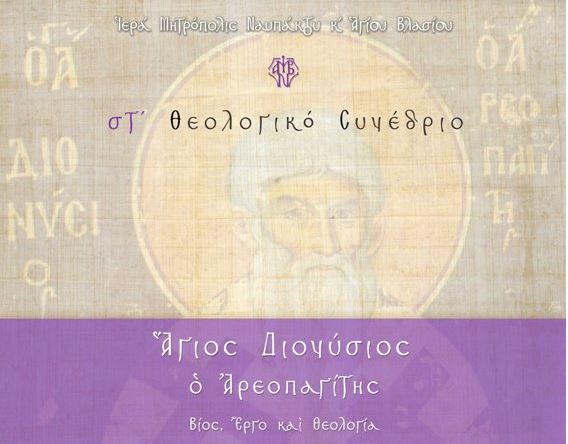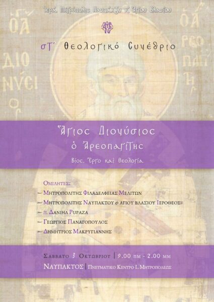To ΣΤ’ Θεολογικό Συνέδριό της διοργανώνει σε περίπου ένα μήνα η Ιερά Μητρόπολη Ναυπάκτου. Συγκεκριμένα, στις 3 Οκτωβρίου (2020) στο Πνευματικό Κέντρο της Μητροπόλεως θα λάβει χώρα το Θεολογικό Συνέδριο με θέμα: «Άγιος Διονύσιος ο Αρεοπαγίτης, Έργο και Θεολογία», ομιλητές του οποίου θα είναι οι εξής:
