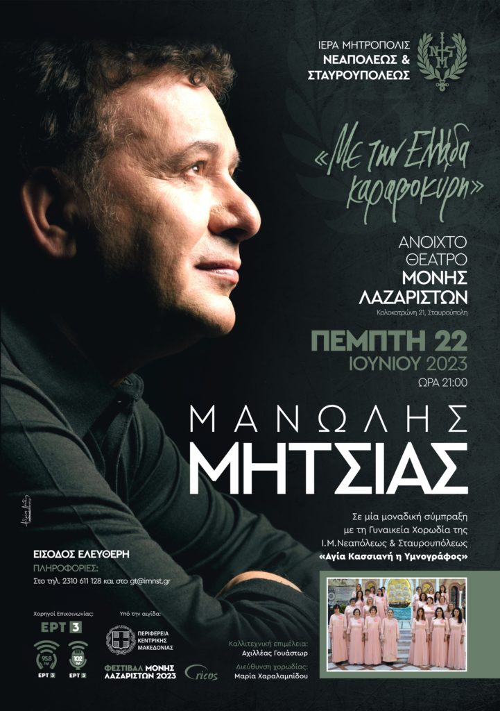 Την Πέμπτη στις 21:00 διοργανώνεται συναυλία του Μανώλη Μητσιά και της γυναικείας χορωδίας της Ιεράς Μητρόπολης Νεαπόλεως και Σταυρουπόλεως “Αγία Κασσιανή η Υμνογράφος” στο ανοιχτό Θέατρο της Ιεράς Μονής Λαζαριστών.