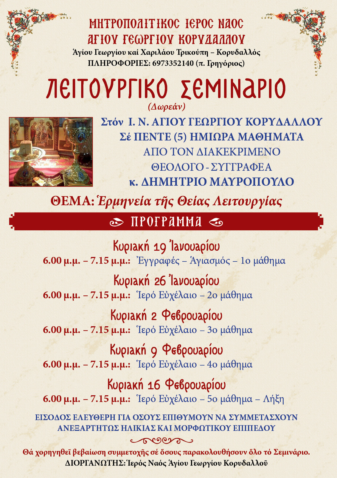 Λειτουργικό Σεμινάριο θα πραγματοποιηθεί δωρεάν στον Μητροπολιτικό Ιερό Ναό Αγίου Γεωργίου Κορυδαλλού σε πέντε (5) συνεχόμενες Κυριακές, από 19 Ιανουαρίου έως 16 Φεβρουαρίου, τα απογεύματα. Ο διακεκριμένος Θεολόγος και Συγγραφέας κ. Δημήτριος Μαυρόπουλος θα ερμηνεύσει σε 5 μαθήματα το Ιερό Μυστήριο της Θείας Λειτουργίας.