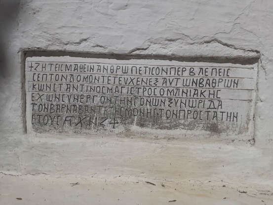 Οι δύο επιγραφές που διασώζονται δίνουν σημαντικές πληροφορίες για το ιστορικό της εκκλησίας. Κατά την είσοδο στον ναό, αριστερά η επιγραφή αναφέρεται στον Μάγιστρο Κωνσταντίνο Μανιάκη, ο οποίος εκ θεμελίων έκτισε τον ναό μαζί με τα δύο του παιδιά. Κατά τη βυζαντινή εποχή Μάγιστρος ήταν τιμητικό αξίωμα που κατά τον 12ο αιώνα εξέλειψε. Η κτητορική επιγραφή αναγράφει την ημερομηνία 1149.