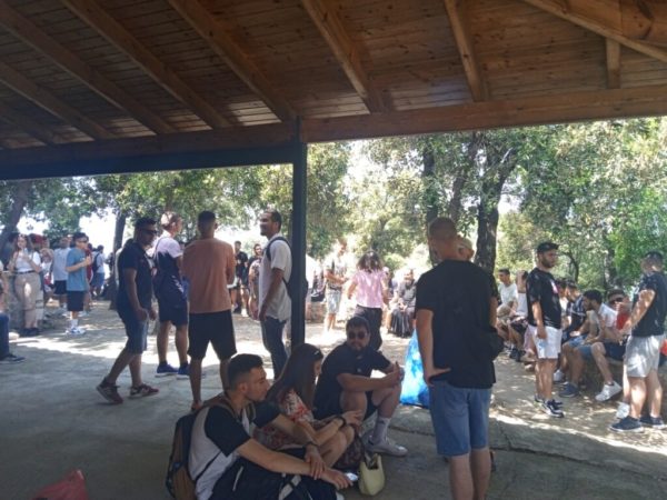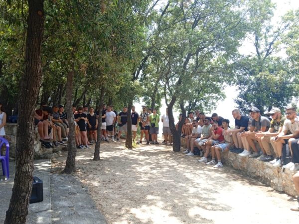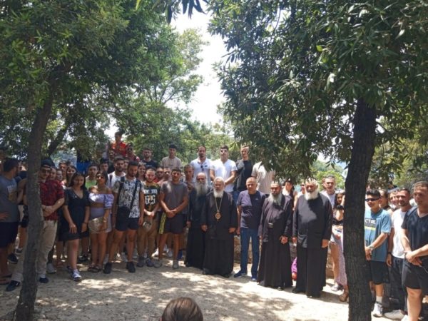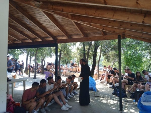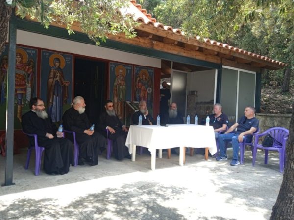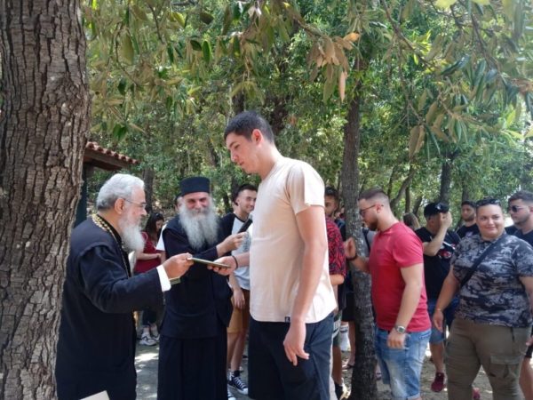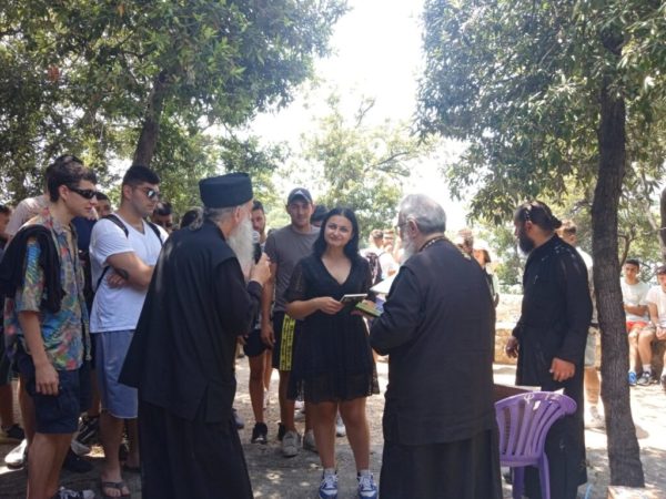 Το μεσημέρι λίγο πριν το μεσημεριανό φαγητό επισκέφθηκε την ωραία παρέα των εκδρομέων ο Σεβασμιώτατος και συνομίλησε μαζί τους, απευθύνοντάς τους λόγους πατρικούς, ώστε να απαντήσουν στις νεανικές τους αναζητήσεις, ενώ κλείνοντας αυτή την σύντομη αλλά εποικοδομητική συνάντηση προσέφερε σε όλους ένα βιβλίο για την πνευματική τους οικοδομή.