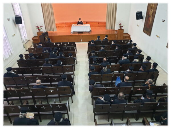Στην κεντρική αίθουσα του Πνευματικού Κέντρου της Ιεράς Μητροπόλεως την Δευτέρα 15 Απριλίου 2019 και ώρα 10:00 π.μ. πραγματοποιήθηκε η μηνιαία Ιερατική Σύναξη των κληρικών της Μητροπόλεως Νικοπόλεως και Πρεβέζης με ομιλητή τον αγιορείτη Ιερομόναχο Γέροντα Νίκωνα, από τη Ξενοφωντινή Σκήτη του Αγίου Όρους με θέμα: “Η πίστη στην πράξη”