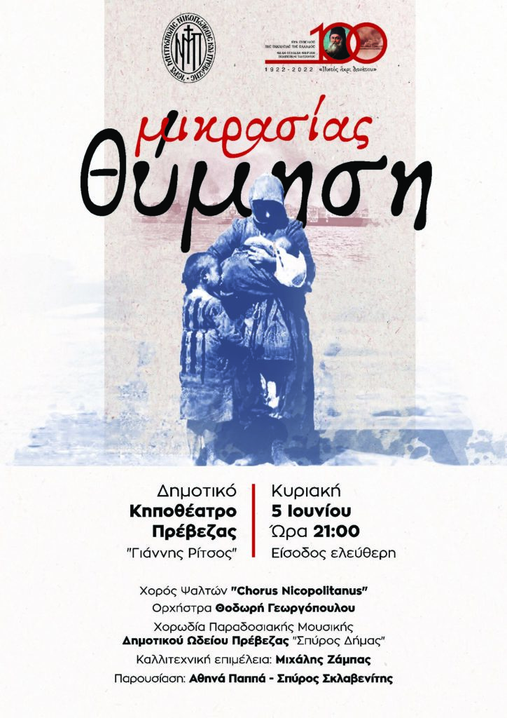 Η Ιερά Σύνοδος της Εκκλησίας της Ελλάδος με φορέα την Ιερά Μητρόπολη Νικοπόλεως και Πρεβέζης, στα πλαίσια των Περιφερειακών Επετειακών Εκδηλώσεων για τα 100 χρόνια από την Μικρασιατική Καταστροφή (1922-2022), θα πραγματοποιήσει μουσική εκδήλωση με τίτλο «ΜΙΚΡΑΣΙΑΣ ΘΥΜΗΣΗ – ΜΟΥΣΙΚΗ ΠΕΡΙΔΙΑΒΑΣΗ ΣΤΑ ΜΟΝΟΠΑΤΙΑ ΤΗΣ ΕΛΛΗΝΙΚΗΣ ΑΝΑΤΟΛΗΣ».