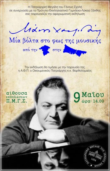Σήμερα Τρίτη 9 Μαΐου 2023, το Πρότυπο Εκκλησιαστικό Γυμνάσιο-Λύκειο Ξάνθης σε συνεργασία με την Πατριαρχική Μεγάλη του Γένους Σχολή θα παρουσιάσει αφιερωματική εκδήλωση με τίτλο “Μάνος Χατζιδάκις, Μία βόλτα στο φως της μουσικής από την Ξάνθη στην Πόλη”.