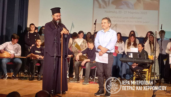 Ο Σεβ. Μητροπολίτης Πέτρας και Χερρονήσου κ. Γεράσιμος, κατά την παραμονή της Εθνικής Εορτής, παρακολούθησε την διπλή εορταστική εκδήλωση που πραγματοποίησε το Γυμνάσιο Νεαπόλεως στο Κινηματοθέατρο “Δρήρος” για την 25η Μαρτίου και το καλωσόρισμα των αδελφών μαθητών και εκπαιδευτικών από το Αδελφοποιημένο Γυμνάσιο του Αγίου Δομετίου Κύπρου.