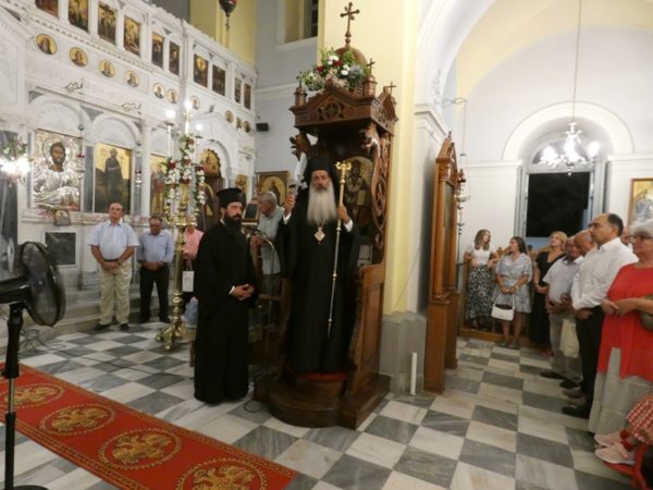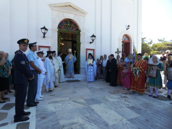 Στην Πάρο και συγκεκριμένα στον πανηγυρίζοντα Ιερό Ενοριακό Ναό Κοιμήσεως Θεοτόκου Ναούσης, των Ιερών Ακολουθιών, κατόπιν προσκλήσεως του Σεβασμιωτάτου Μητροπολίτη Παροναξίας κ. Καλλινίκου, προέστη ο Σεβασμιώτατος Μητροπολίτης Φθιώτιδος κ. Συμεών, ο οποίος κατά την παραμονή της εορτής χοροστάτησε στον Εσπερινό, ευλόγησε τους προσφερθέντες άρτους και κήρυξε τον θείο λόγο.