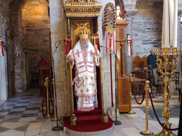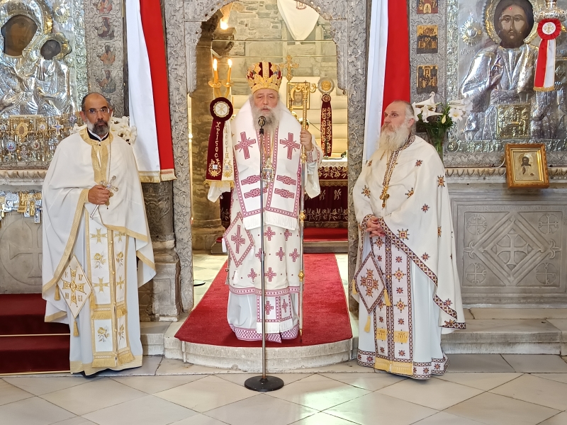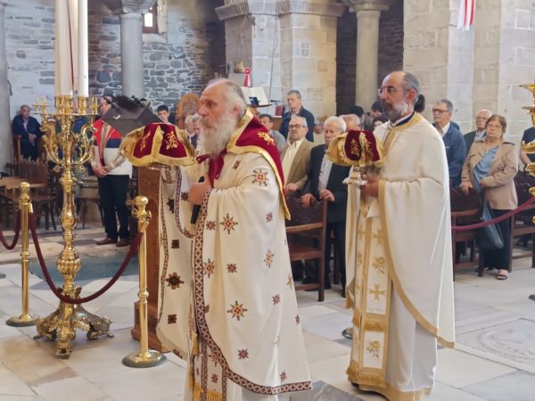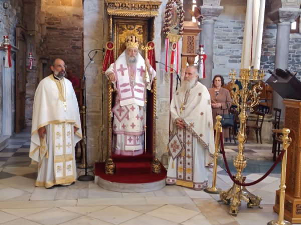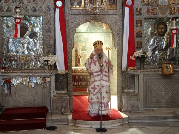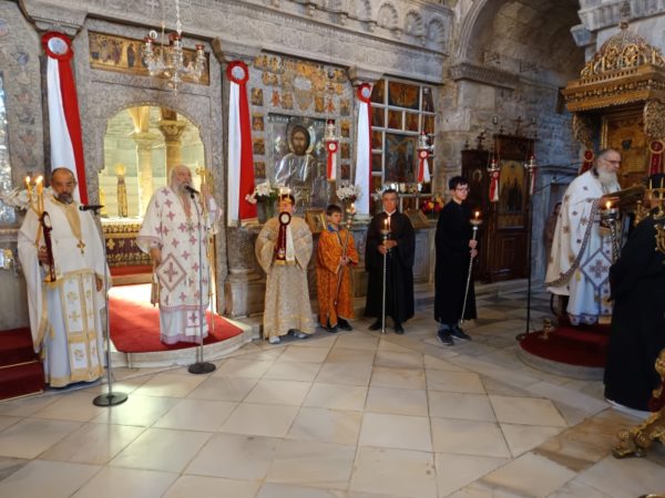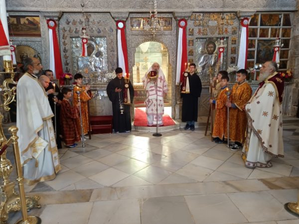 Τον Σεβασμιώτατο Ποιμενάρχη, πλαισίωσαν οι πατέρες του Ιερού Προσκυνήματος, Πρωτοπρ. π. Στυλιανός Μπιζάς (Αντιπρόεδρος της Δ.Ε. του Προσκυνήματος) και ο Πρωτοπρ. π. Χρήστος Πετρόπουλος.