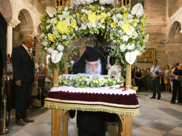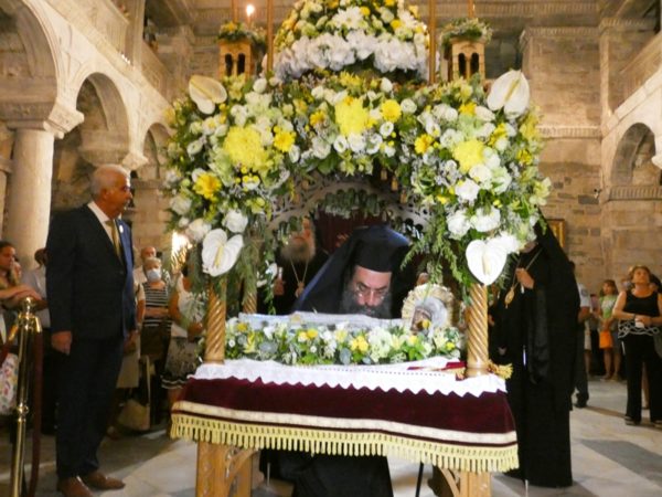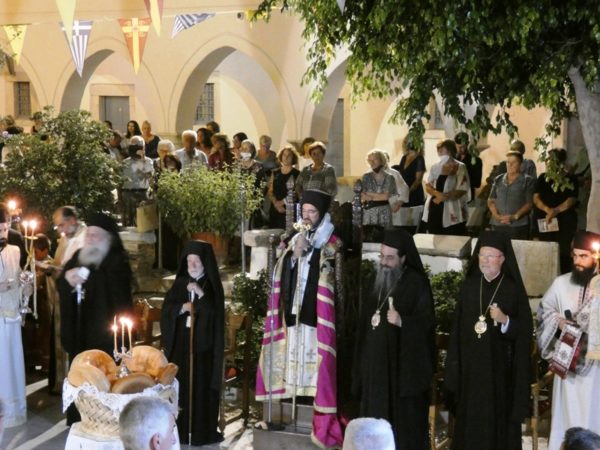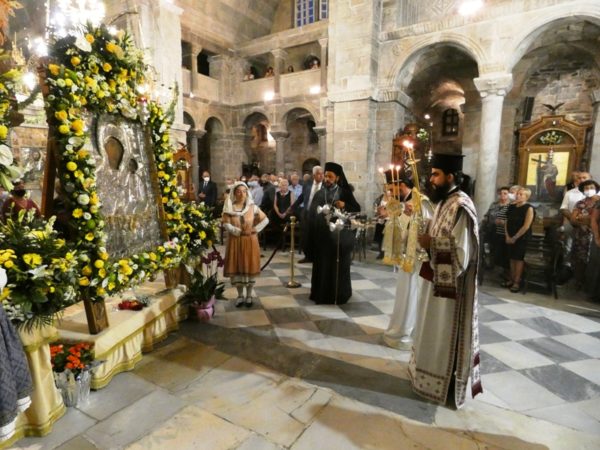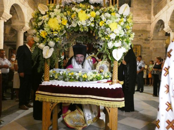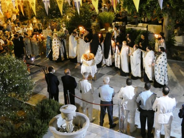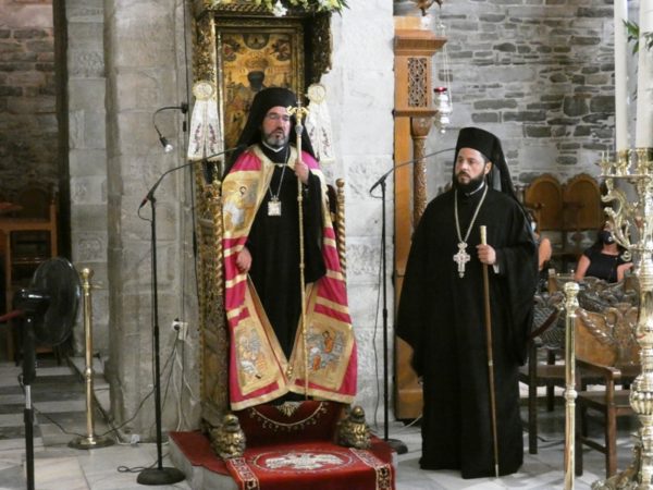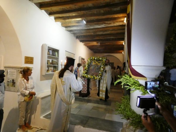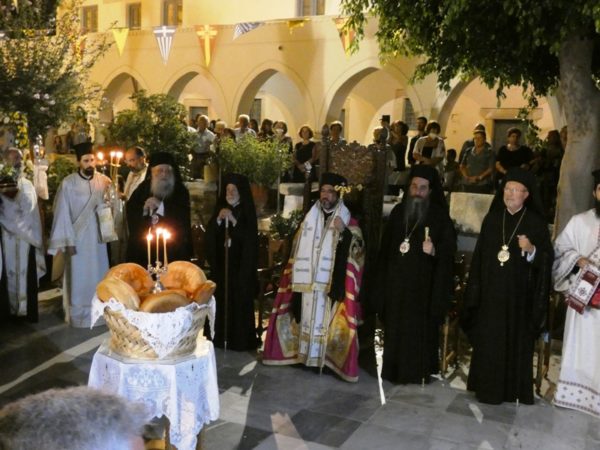 Με την τέλεση πανηγυρικού Εσπερινού το απόγευμα της Κυριακής ξεκίνησαν οι λατρευτικές εκδηλώσεις στο πανηγυρίζον Ιερό Προσκύνημα Παναγίας Εκατονταπυλιανής Πάρου, επί τη εορτή της Κοιμήσεως της Υπεραγίας Θεοτόκου.