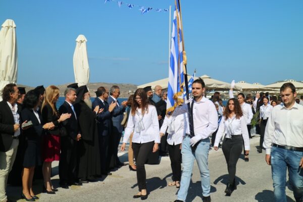 Ακολούθως, ο Σεβασμιώτατος συνοδευόμενος από τον Ιερό Κλήρο, τον Δήμαρχο Πάρου, τον Έπαρχο Πάρου-Αντιπάρου, όλες τις Τοπικές Αρχές και το σύνολο της μαθητιώσας νεολαίας της Παροικίας, μετέβη στο Ηρώο της Πόλεως όπου τέλεσε Τρισάγιο υπέρ Αναπαύσεως των Πεσόντων κατά τον πόλεμο του ’40 – ’41. Αφού πραγματοποιήθηκε η κατάθεση στεφάνων, ακολούθησε τήρηση ενός λεπτού σιγή στη μνήμη των Πεσόντων υπέρ Πίστεως και Πατρίδος και ανάκρουση του Εθνικού Ύμνου. Αμέσως μετά παρηκολούθησε την καθιερωμένη παρέλαση στην παραλιακή λεωφόρο του νησιού.