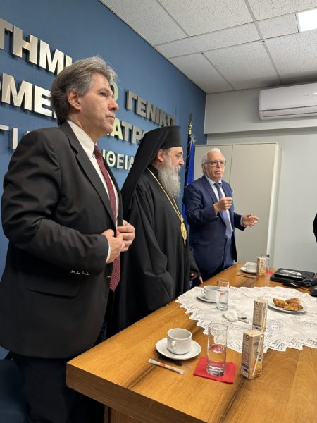 Μετά την Θεία Λειτουργία, ο Σεβασμιώτατος είχε συνεργασία με τον Διοικητή του Νοσοκομείου κ. Δημήτριο Μπάκο, τον Αναπληρωτή Διοικητή, κ. Ανδρέα Μαζαράκη, και άλλους εκ του προσωπικού του Νοσηλευτικού Ιδρύματος, για την βοήθεια και συμπαράσταση των εκεί νοσηλευομένων συνανθρώπων μας.