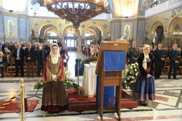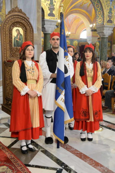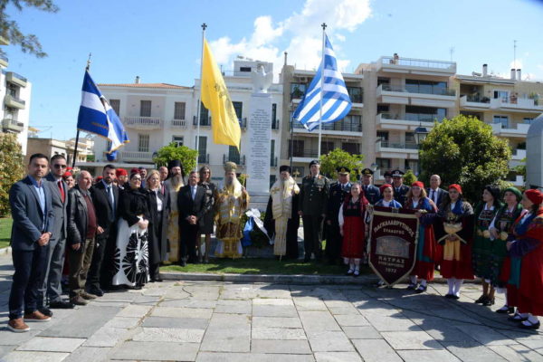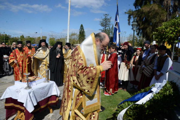 Ἐντιμότατοι Ἂρχοντες, ἀγαπητοί μου, καθώς βλέπω αὐτή τή στιγμή μπροστά μου σ’ αὐτόν τόν Ναό, τά νειᾶτα τῆς Πάτρας νά κρατᾶνε στά χέρια τους, τά σύμβολα τῆς δόξης, τῆς τιμῆς καί τῆς νίκης, φορώντας τίς Ἐθνικές τετιμημένες φορεσιές, σκορπίζοντας ρίγη συγκινήσεως στίς καρδιές μας, αἰσθάνομαι τήν ἀνάγκη, ἀπό τά τρίσβαθα τῆς ψυχῆς μου νά τούς εὐχαριστήσω καί ὡς λόγον ἀκροτελεύτιον νά σημειώσω.