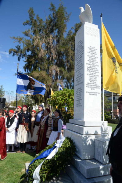 Εν συνεχεία, τελέσθηκε το πάνδημο μνημόσυνο των Σφαγιασθέντων και τέλος, μπροστά στο μνημείο που στήθηκε προς τιμήν τους, ανεπέμφθη επιμνημόσυνη δέηση, και ο Σεβασμιώτατος κατέθεσε δάφνινο στεφάνι εκ μέρους του Ιερού Κλήρου και του ευσεβούς Λαού της Αποστολικής Μητροπόλεως των Πατρών.