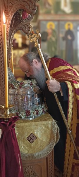 Ο Σεβασμιώτατος στο κήρυγμα του αναφέρθηκε στη θεολογία των αγίων Λειψάνων και στα στοιχεία τα οποία συνιστούν την ιερότητά τους, όπως είναι η αφθαρσία, η ευωδία και μυροβλυσία και η επιτέλεσις θαυμάτων και σημείων διά πρεσβειών των Αγίων, των οποίων τιμούμε τα Λείψανα.
