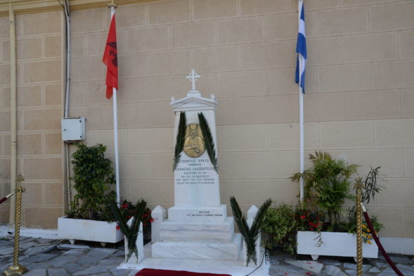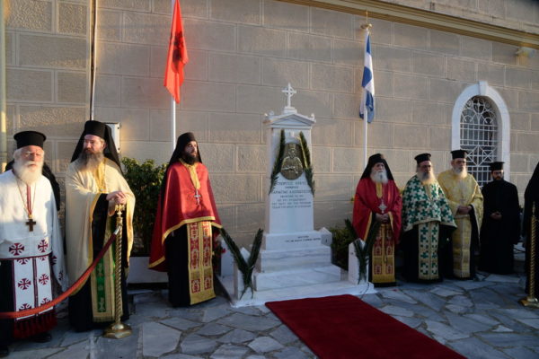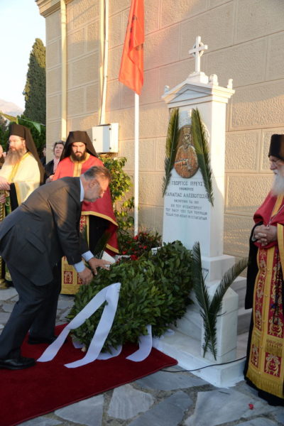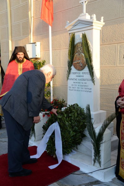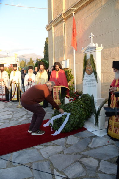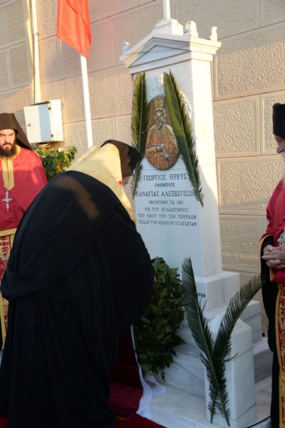 Μετά τον Εσπερινό ανεπέμφθη δέησις ενώπιον της προτομής του Εθνομάρτυρος Ιερέως και κατετέθησαν στέφανοι.