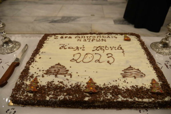 Στην αρχή τελέστηκε μέγας Αρχιερατικός Εσπερινός χοροστατούντος του Μητροπολίτου Πατρών κ. Χρυσοστόμου, ο οποίος ευλόγησε την βασιλόπιτα, η οποία προσεφέρθη προς δόξαν Θεού και τιμήν του Ουρανοβάμονος Βασιλείου του Μεγάλου και εις ευλογίαν του ιεροψαλτικού κόσμου της Ιεράς Μητροπόλεως Πατρών.