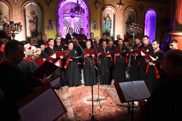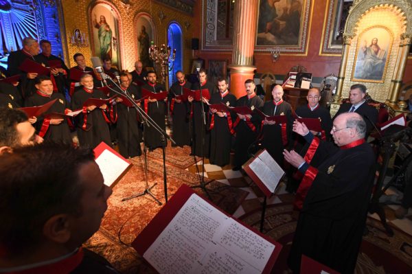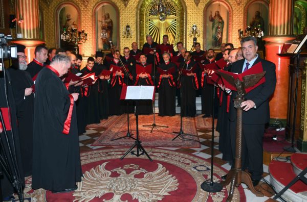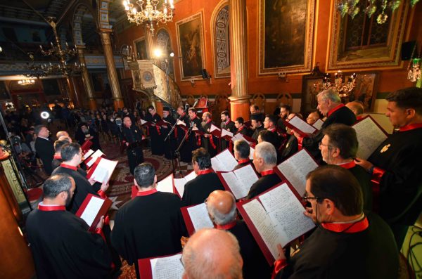 Στον κατάμεστο ναό, ο Βυζαντινός χορός παρουσίασε  ένα ιδιαίτερα απαιτητικό μουσικό πρόγραμμα μιας ώρας, με επιλεγμένους Βυζαντινούς ύμνους Τριωδίου και Θεομητορικά μέλη αφιερωμένα στην μεγάλη εορτή του Ευαγγελισμού της Θεοτόκου, υπό την διεύθυνση του χοράρχη του, Μουσικολογιωτάτου Πρωτοψάλτου του Ι. Ναού Αγίας Σοφίας Πατρών κ. Χαραλάμπους Θεοτοκάτου.