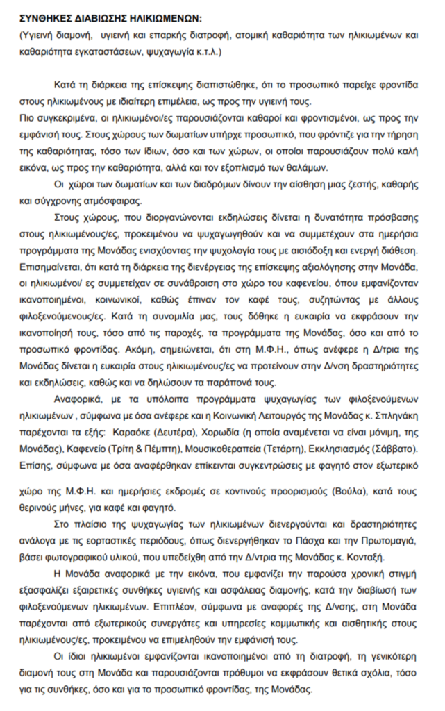 Αφού έγινε έλεγχος σε όλους τους χώρους του Γηροκομείου και εξετάστηκαν οι συνθήκες διαβίωσης των τροφίμων, ύστερα από συνομιλία με τους γέροντες και τις γερόντισσες του ιδρύματος, στην έκθεση αξιολόγησης οργάνωσης και λειτουργίας που αφορά στις συνθήκες διαβίωσης των ηλικιωμένων, μεταξύ άλλων, αναφέρεται: «Η μονάδα αναφορικά με την εικόνα που εμφανίζει την παρούσα χρονική στιγμή εξασφαλίζει εξαιρετικές συνθήκες υγιεινής και ασφάλειας διαμονής, κατά την διαβίωση των φιλοξενούμενων ηλικιωμένων. Οι ίδιοι οι ηλικιωμένοι εμφανίζονται ικανοποιημένοι από την διατροφή, την γενικότερη διαμονή τους στη μονάδα και παρουσιάζονται πρόθυμοι να εκφράσουν θετικά σχόλια τόσο για τις συνθήκες, όσο και για το προσωπικό φροντίδας της μονάδας».