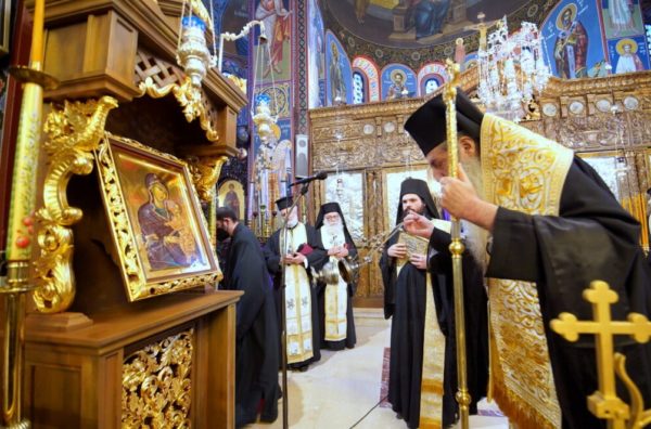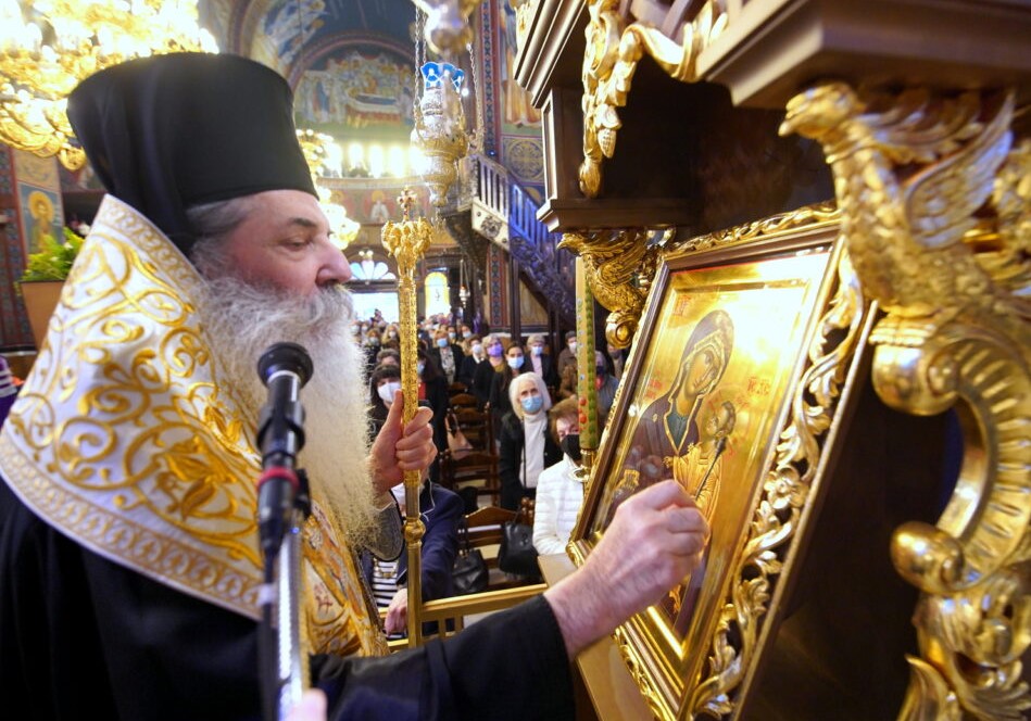 «Η Παναγία είναι η των πάντων χαρά. Και των ανθρώπων και των Αγγέλων και όλων των υπάρξεων», σημείωσε ο Σεβασμιώτατος εκφράζοντας τη συγκίνησή του γιατί η Ιερά αυτή Εικόνα «ανακαλεί στη μνήμη μας αυτό το αίσθημα της χαράς που πρέπει να έχουμε ως πιστοί και που είναι το μοναδικό σύνθημα του Αναστάντος Χριστού: ‘’Χαίρετε… και πάλιν ερώ Χαίρετε’’».