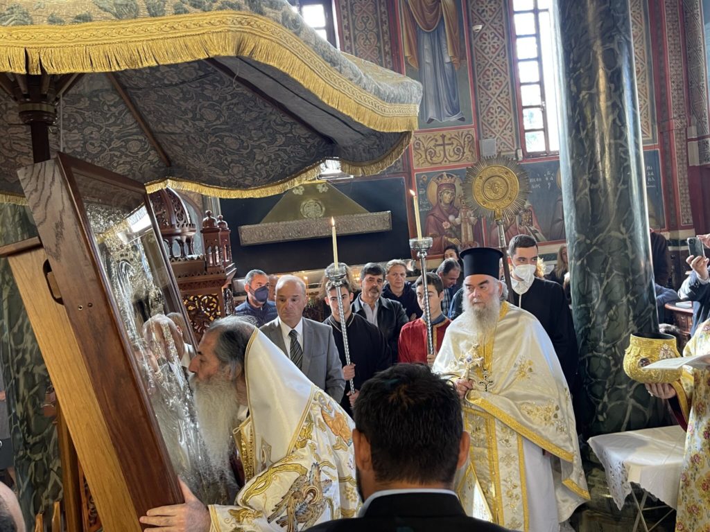 Προ της Απολύσεως η Ιερά Εικόνα τοποθετήθηκε στο μέσον του Ναού, κατά την Αγιορείτικη Τάξη, όπου και θα παραμείνει έως τις 26 Νοεμβρίου, ημέρα κατά την οποία θα ανέλθει και πάλι στο Προσκυνητάριο του Μητροπολιτικού Ιερού Ναού.