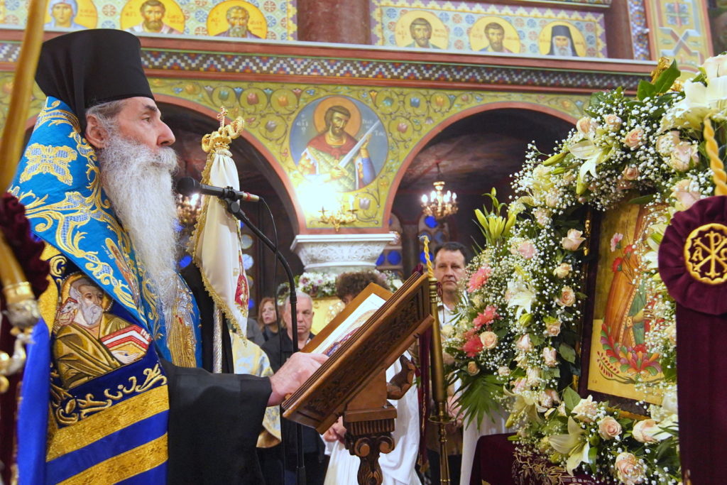 Ο Σεβασμιώτατος υπενθυμίζοντας ότι η Παναγία μας καθαγίασε τον Ιερό Ναό με την θαυμαστή ανεύρεση, στην Πειραϊκή ακτή, της Ιεράς Εικόνος της το 1895 και στην απαλλαγή από την θανατηφόρα λοιμική νόσο της ευλογιάς, εξέφρασε τις ευχαριστίες του στον «εκλεκτό αδελφό και υπέροχο άνθρωπο», όπως χαρακτηριστικά είπε, Σεβασμιώτατο Μητροπολίτη Μεγάρων και Σαλαμίνος κ. Κωνσταντίνο, «ο οποίος είναι και βλάστημα της καθ’ ημάς Ιεράς Μητροπόλεως Πειραιώς για την κανονική του συγκατάθεση, άδεια και ευλογία», καθώς και στην Οσιωτάτη Καθηγουμένη Γερόντισσα Παρθενία, στην οποία πρόσφερε έναν Ηγουμενικό Σταυρό σε ένδειξη ευγνωμοσύνης και τιμής προς την αδελφότητα της Ιεράς Μονής.