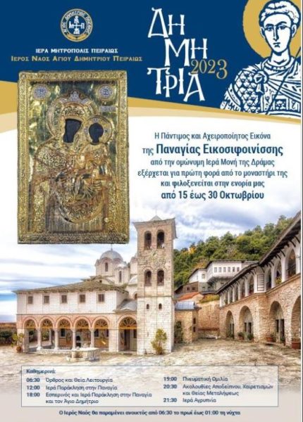 Στα φετινά Δημήτρια φιλοξενείται η Πάντιμος, Αχειροποίητος και Θαυματουργή Εικόνα της Παναγίας της Εικοσιφοινίσσης από την ομώνυμη Ιερά Μονή της Ιεράς Μητροπόλεως Δράμας, η οποία θα παραμείνει καθ΄ όλη τη διάρκεια των εκδηλώσεων προς αγιασμό και οικοδομή του πιστού λαού του Πειραιά, αλλά και του λεκανοπεδίου της Αττικής. Η Ιερά Εικόνα εξέρχεται εκ του θρόνου της πρώτη φορά στην ιστορία των 15 αιώνων της.