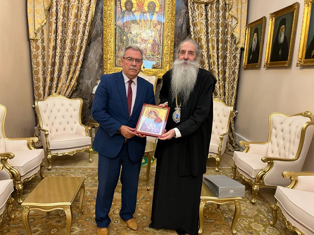 O υποψήφιος Δήμαρχος Καλαβρύτων Θανάσης Κανελλόπουλος επισκέφθηκε την Δευτέρα 25 Σεπτεμβρίου 2023 στα γραφεία της Ιεράς Μητροπόλεως Πειραιώς στο «ΜΑΡΙΝΑΚΕΙΟΝ ΜΕΛΑΘΡΟΝ», τον Σεβασμιώτατο Μητροπολίτη Πειραιώς κ. Σεραφείμ.