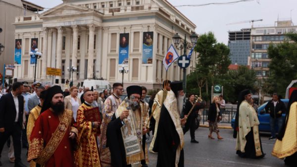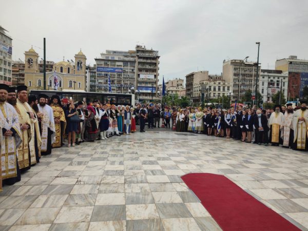 Έξω από το Δημοτικό Θέατρο Πειραιά τελέστηκε δέηση παρουσία πολιτικών, πολιτιστικών συλλόγων, κληρικών και του πιστού λαού.