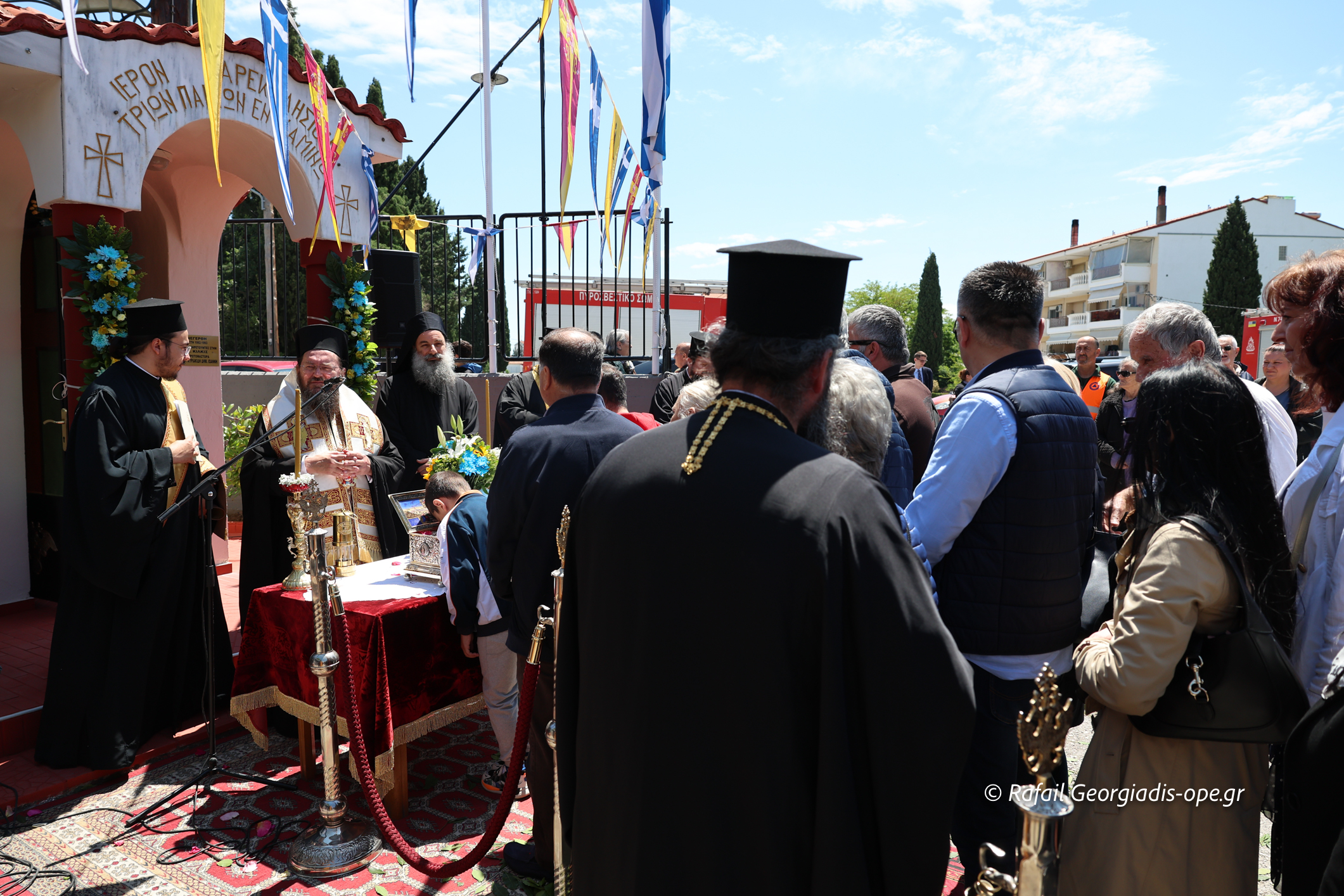 Μπροστά από το Ιερό Παρεκκλήσι των Τριών Παίδων εν καμίνω που βρίσκεται στον αύλειο χώρο της Πυροσβεστικής Υπηρεσίας, τελέσθηκε δέηση από τον Σεβασμιώτατο και ακολούθησε προσκύνηση.
