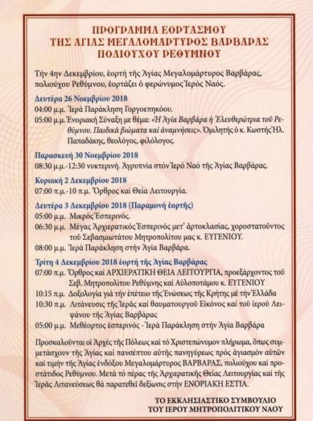 Την πολιούχο της Αγία Μεγαλομάρτυρα Βαρβάρα θα εορτάσει το Ρέθυμνο στον φερώνυμο Ιερό Ναό με λατρευτικές εκδηλώσεις στις 4 Δεκεμβρίου 2018. Στην παρακάτω αφίσα διαβάστε αναλυτικά το πρόγραμμα