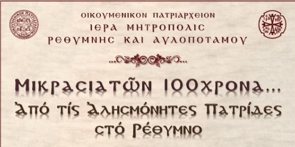 Η Ιερά Μητρόπολη Ρεθύμνης και Αυλοποτάμου, με αφορμή τη συμπλήρωση 100 ετών από τη Μικρασιατική Καταστροφή και τον ξεριζωμό του Ελληνισμού της Μικρασίας από τις εστίες τους, διοργανώνει, με την υποστήριξη της Αντιπεριφέρειας Ρεθύμνου, Εκδήλωση Μνήμης για την ανείπωτη εκείνη τραγωδία, που έκτοτε στοιχειώνει στο διηνεκές τη συλλογική συνείδηση του Γένους μας.