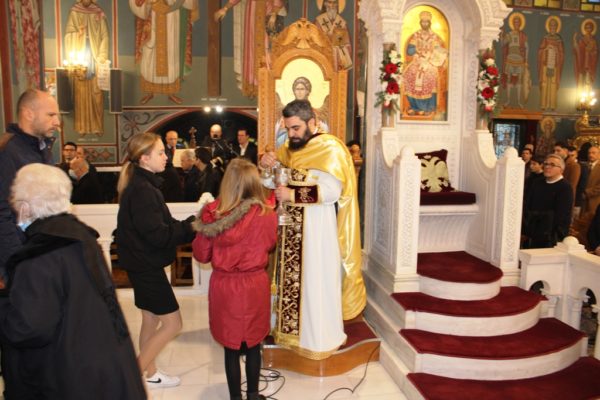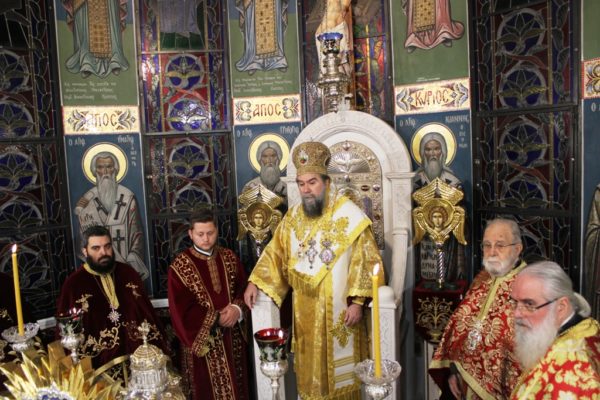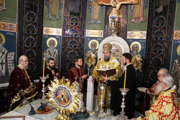 Κατά το ιερό λειτουργικό Τυπικό, ο Σεβασμιώτατος, στο τέλος του πανηγυρικού Όρθρου, ενδύθηκε τα Αρχιερατικά του άμφια στο μέσον του σολέα και ακολούθησε η πανηγυρική θ. Λειτουργία του Μεγ. Βασιλείου, στην οποία συμμετείχαν συμπροσευχητικώς μεταξύ άλλων και ο Βουλευτής Ν. Σερρών κ. Κ. Μπούμπας, η τέως Βουλευτής και Υπουργός Σερρών κ. Μ. Κόλλια-Τσαρουχά, ο Δήμαρχος Σερραίων κ. Αλ. Χρυσάφης, ο τέως Δήμαρχος Σερραίων κ. Ι. Βλάχος, ο Διοικητής του 10ου Συντάγματος ΠΖ κ. Αδ. Σαρρής, ο Πρόεδρος του Δημ. Συμβουλίου Σερρών κ. Β. Κατιρτζόγλου και μέγα πλήθος ευλαβών πιστών, πολλοί από τους οποίους προσήλθαν στο ποτήριο της ζωής.